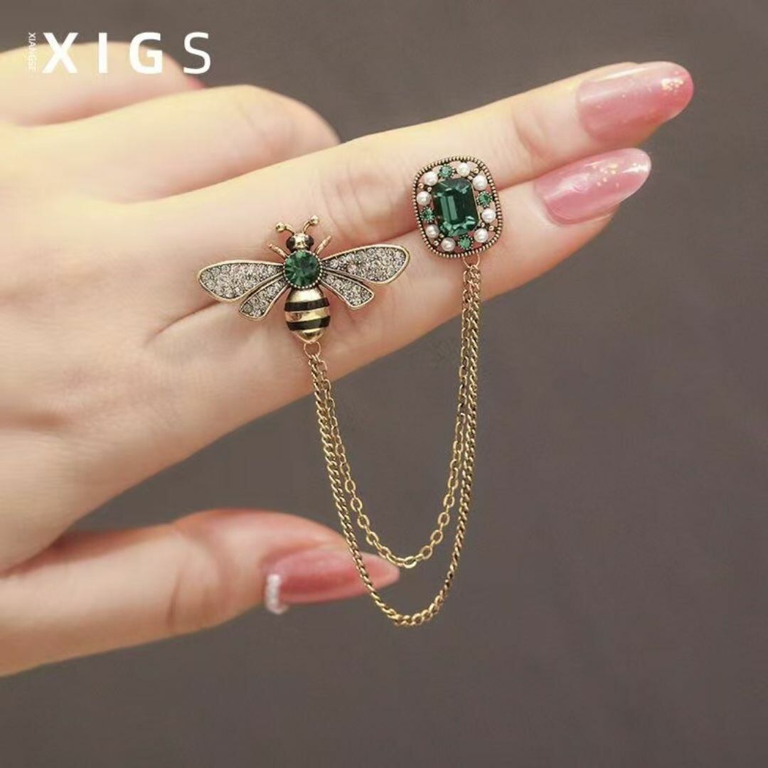 【ブローチピン 蜂】1点入り、グリーン+ゴールド 蜂のようなタイプのブローチタックピン、フォーマルな場合に使用はオススメ!エレガント魅力を十分に出せます。レトロ 蜂 チェーン ピンバッジ ブローチ鮮やかで、服の上でとても目を引き、主に普段着でエレガントに見せるために使われます。
