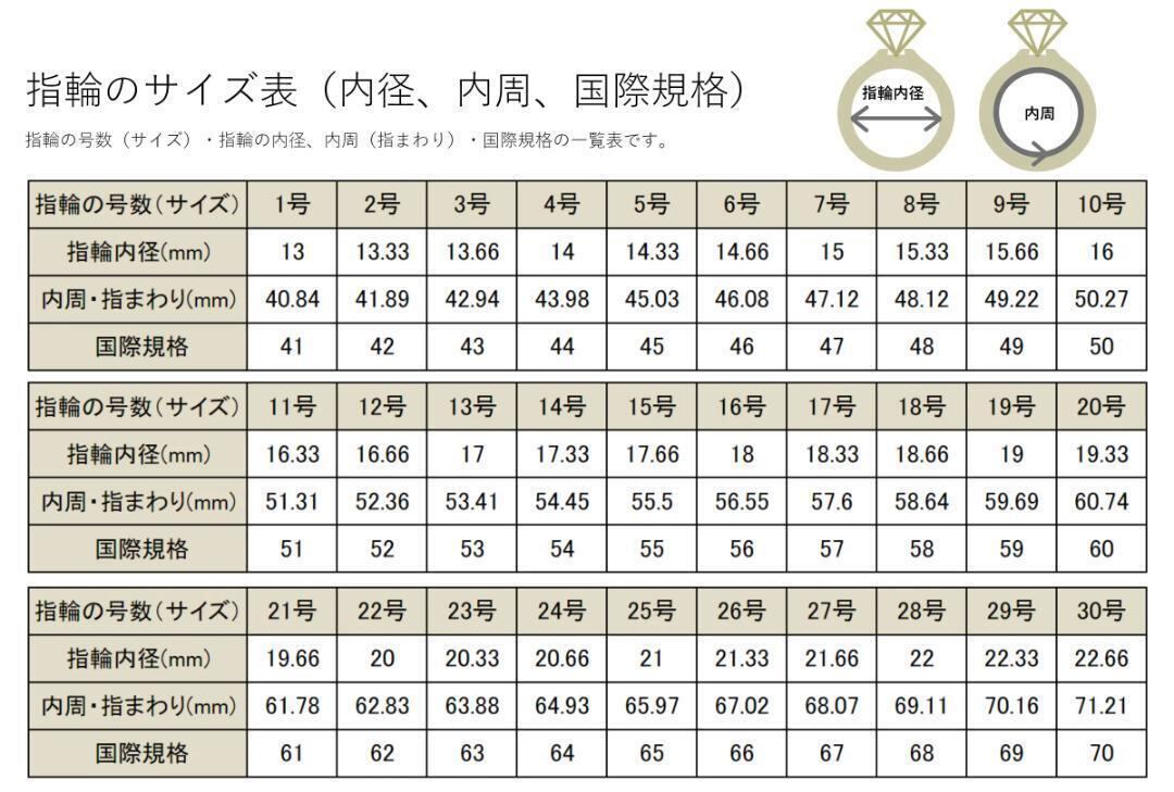 【次の点にご注意下さい】・幅が広いデザインは通常のリングサイズよりきつく感じますので、0.5~1号程度大きめのサイズが良い場合があります。・測る時間帯によって指のサイズは多少異なりますので(むくみなどで)朝・夕2回測ることをおすすめします。・あくまでも目安ですので、きっちりとしたサイズをお調べになりたい方は店舗にてお測りすることもできますので、お気軽にお越しください。