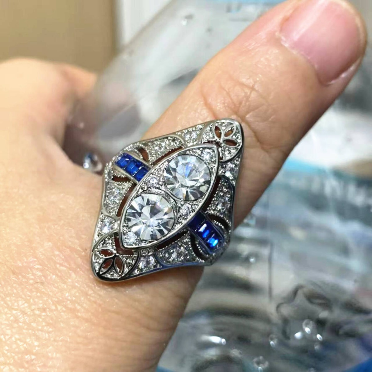 5mmほどの大きさのCZダイヤ 二つを使用しているので、程よい存在感と高級感を感じることができます。両サイドに魅惑的なブルーカラーの石をまとめまして、抜群に輝いています、飽きのこないお洒落デザインですのでお薦めでございます。