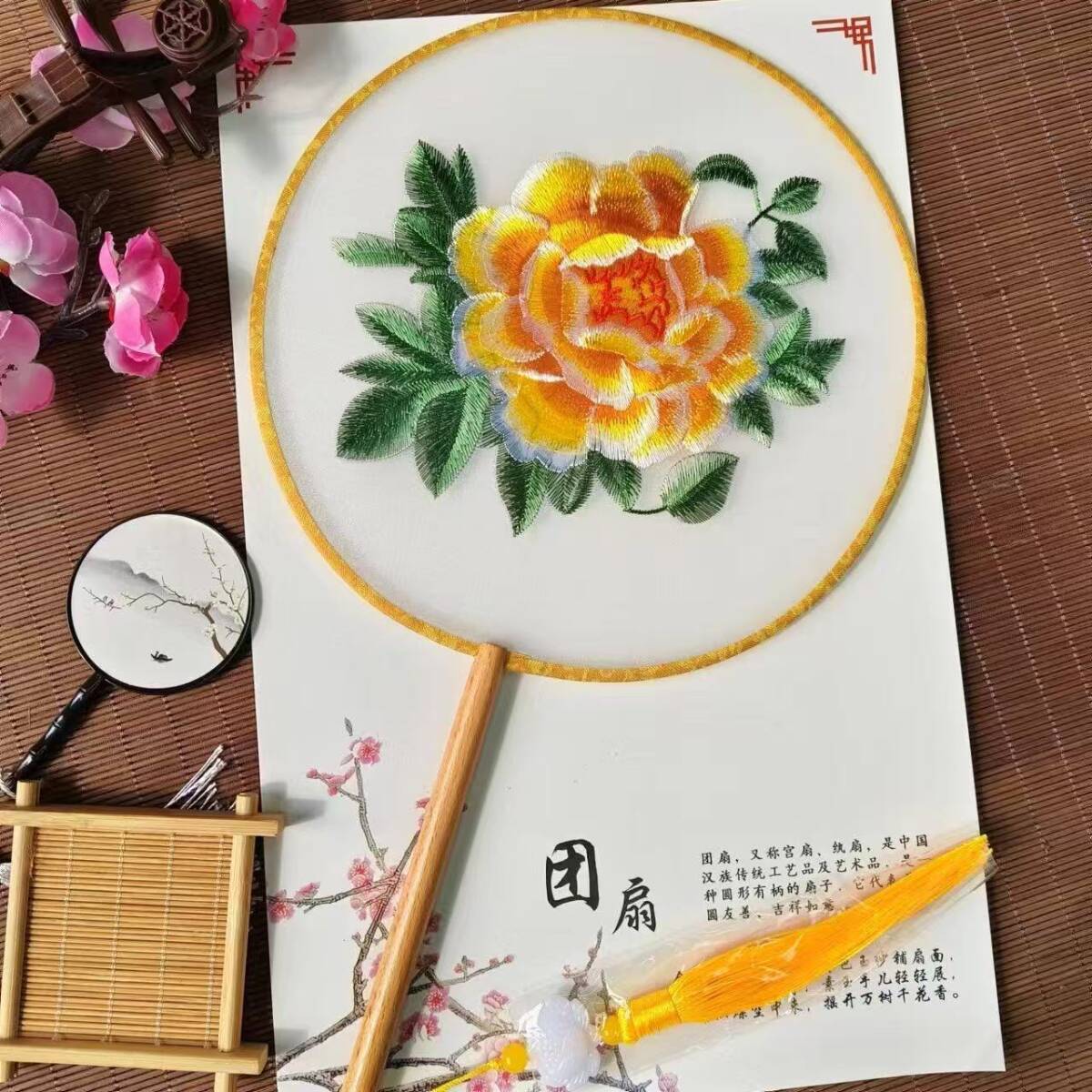 うちわ 両面刺繍 上品 花柄 透け感 団扇 伝統手芸 花火大会 踊り 黄牡丹
