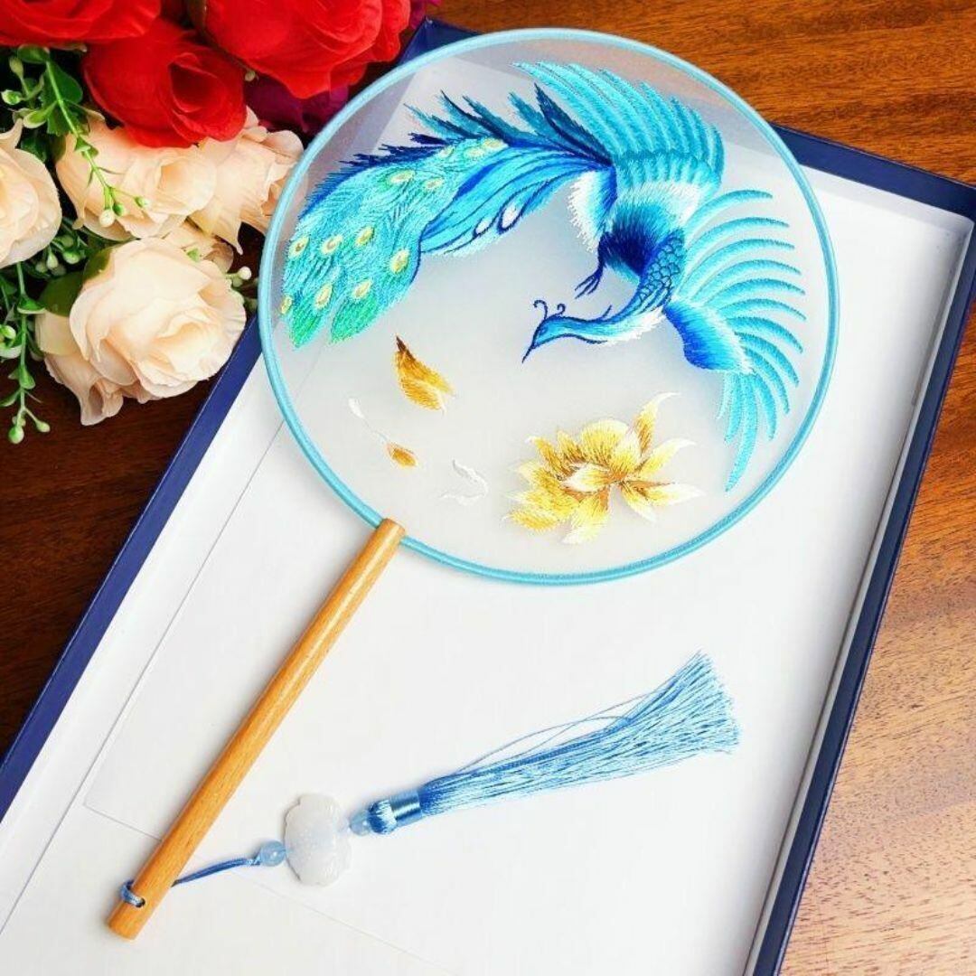 うちわ 両面刺 上品 花柄 団扇 和装 浴衣 花火大会 踊り ブルー 鳳凰